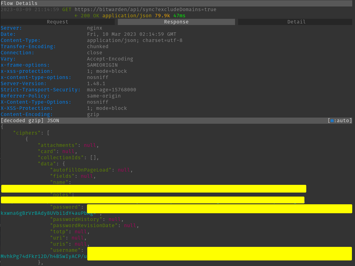 But the interesting thing I found was that self hosted Bitwarden already responds to API requests like you saw in the mitmproxy flow. I think self hosted instances do this but maybe not the ones in the cloud which the bw serve command might be for to run an API from your host.