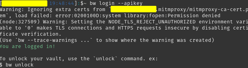 When I was originally testing the Bitwarden CLI I had authenticated with my Email and Master password. You are then given a session that basically keeps you authenticated. I went and tried the API Client authentication next and still had the session open. This confused me as I thought using the API Client ID and Secret you would be able to access your credentials in the Vault. This is incorrect, but I thought I could.